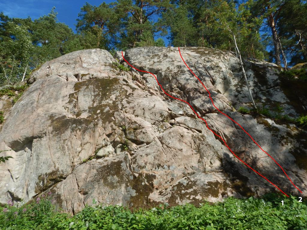 1. Brakskiten, 2+, trad, följer den övertydliga linjen snett åt vänster över klippan. Lätt och behaglig uppvärmning och måste klättras för att den finns där även om den inte utgör någon utmaning i övrigt. (R. Karrlander + A. Axelsson)