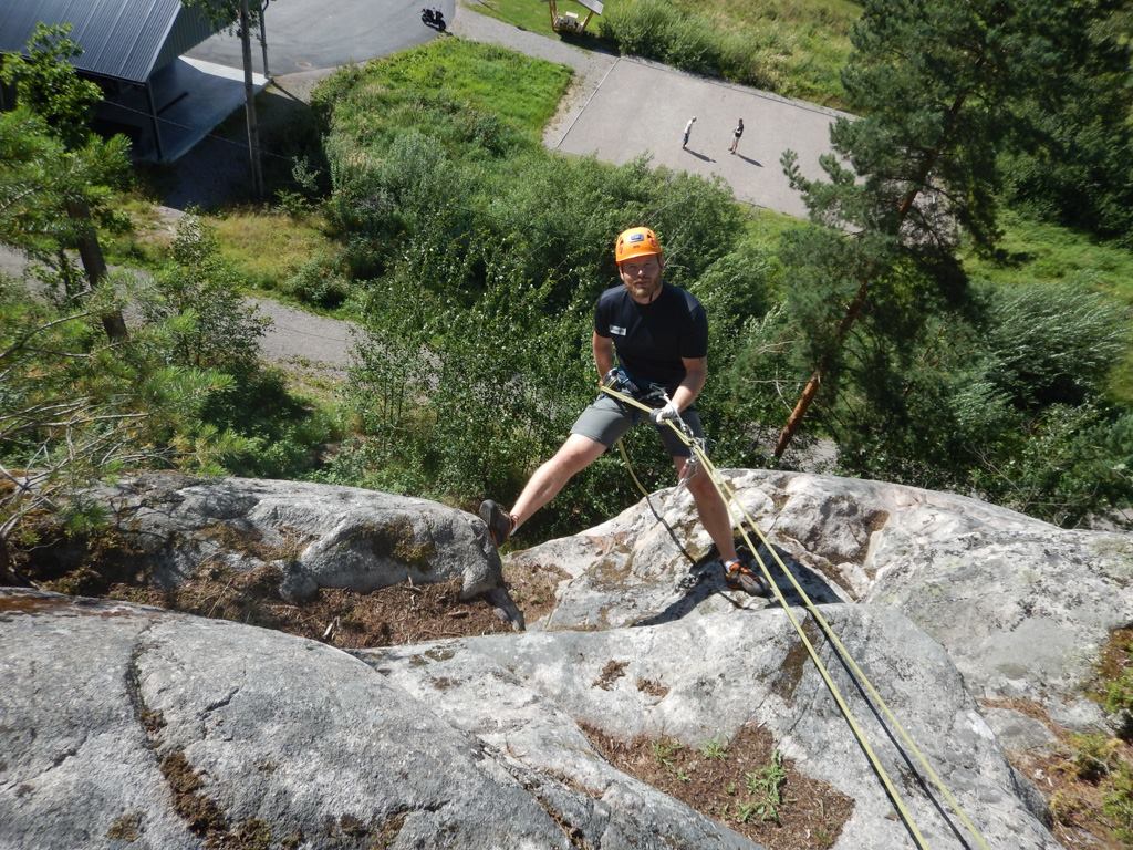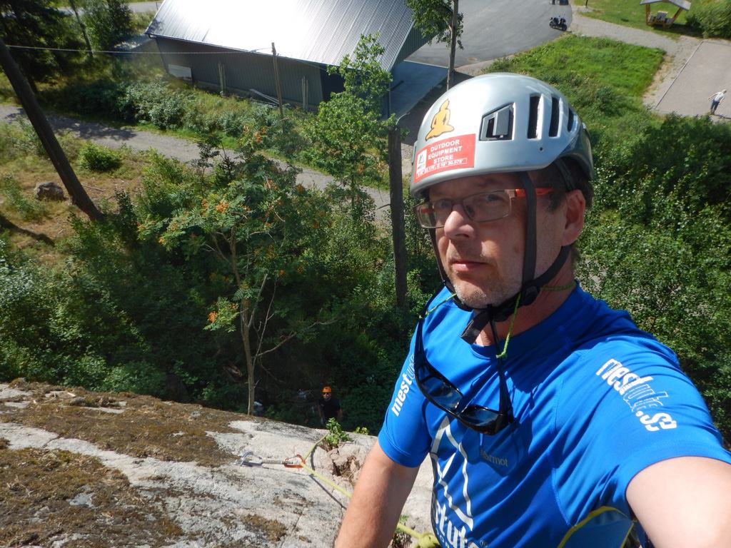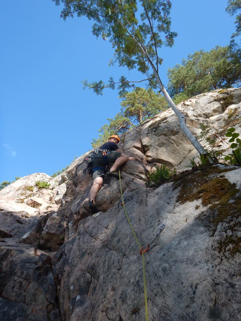 Det saknas just nu ankare i toppen men det går bra att toppa ur och gå tillbaka ner på sidan eller rigga topprepsankare i någon av alla de tallar som står nära klippkanten.